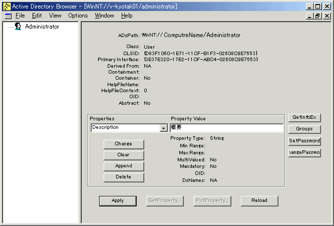 ADSI Viewer を使用すると、LDAP プロバイダや WinNT プロバイダを使用して、ディレクトリサービスにアクセスし、情報の取得や、変更などを行うことが可能です。スクリプト内で、ADSI パスが間違っているかなど確認するのに便利です。また、全てではないですが、ほとんどのプロパティ名も確認できるので、取得したい情報のプロパティ名を検索するときにも役に立つかもしれません。