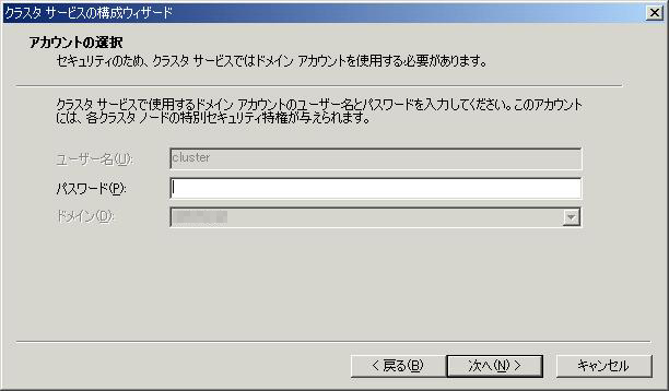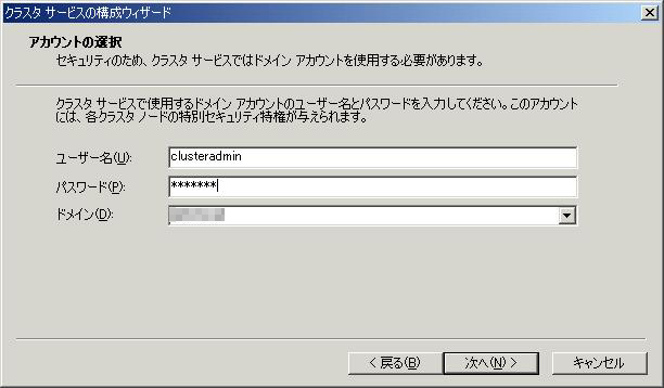 クラスタサービスアカウントは、ドメインのアカウントでなくてはいけません。