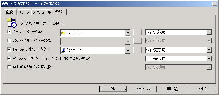 オペレータの設定は、sysoperators テーブルに格納され、sp_add_operator ストアドプロシージャを使用することにより作成も可能です。 作成したオペレータは、右図のようにジョブで設定することで、ジョブが完了したときや、エラー終了したときに通知を行うことができます。ただし、一つのジョブに設定できるオペレータは一つだけです。また、ジョブ失敗時、成功時、完了時それぞれに設定することはできません。 |